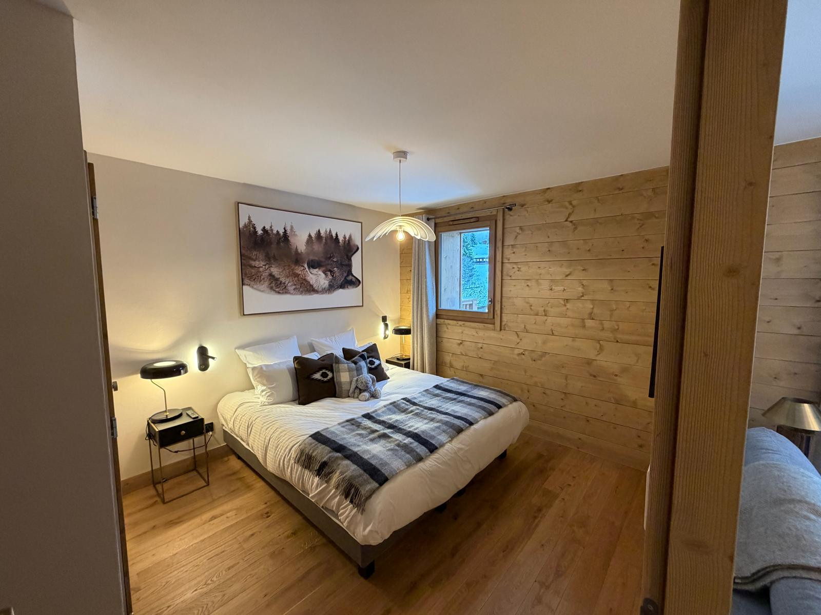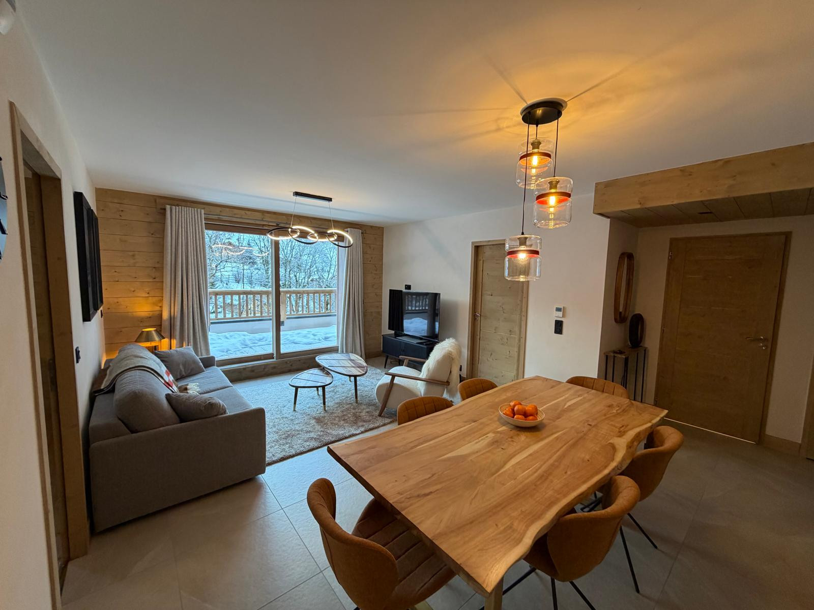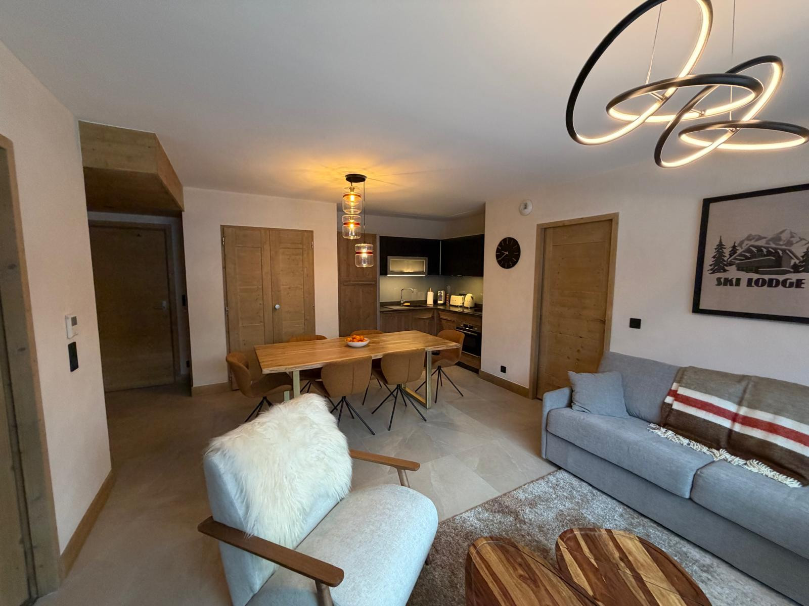 L’appartement est meublé avec goût, dans un style montagne moderne et sophistiqué, mêlant matériaux chaleureux et décoration contemporaine.