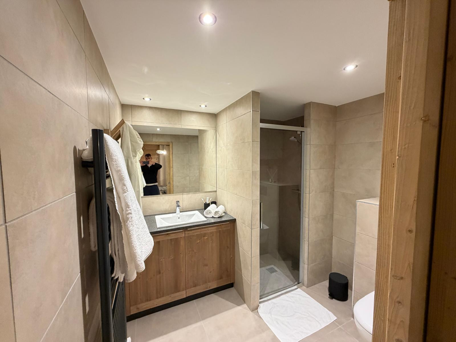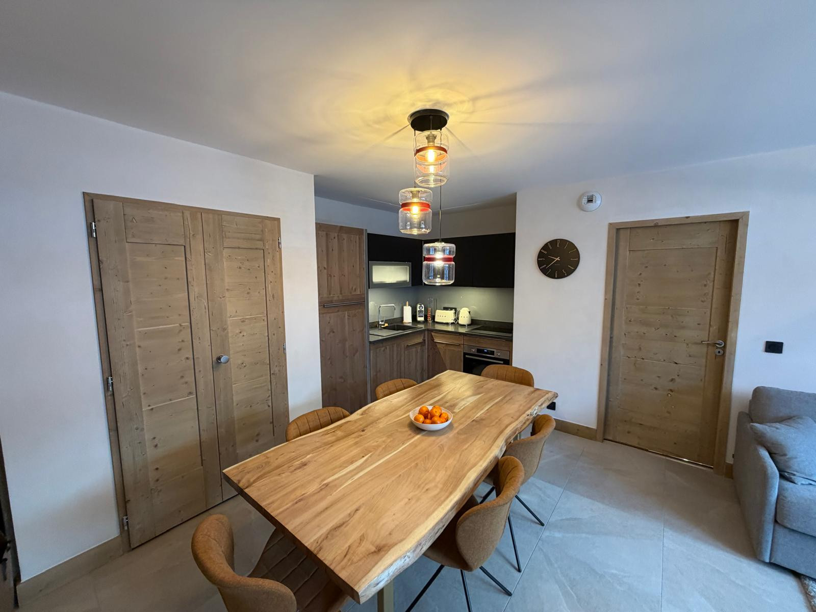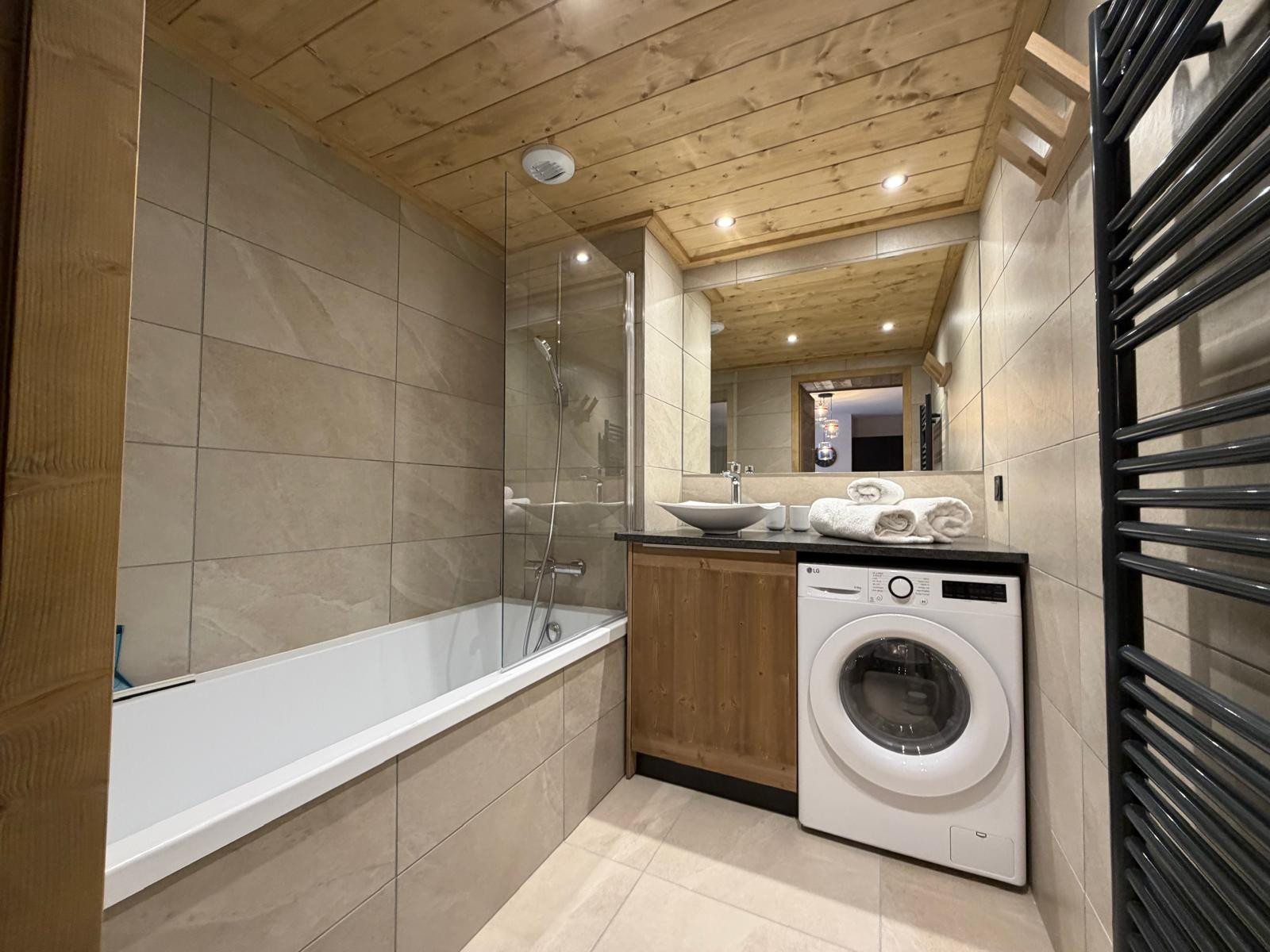 L’appartement est meublé avec goût, dans un style montagne moderne et sophistiqué, mêlant matériaux chaleureux et décoration contemporaine.