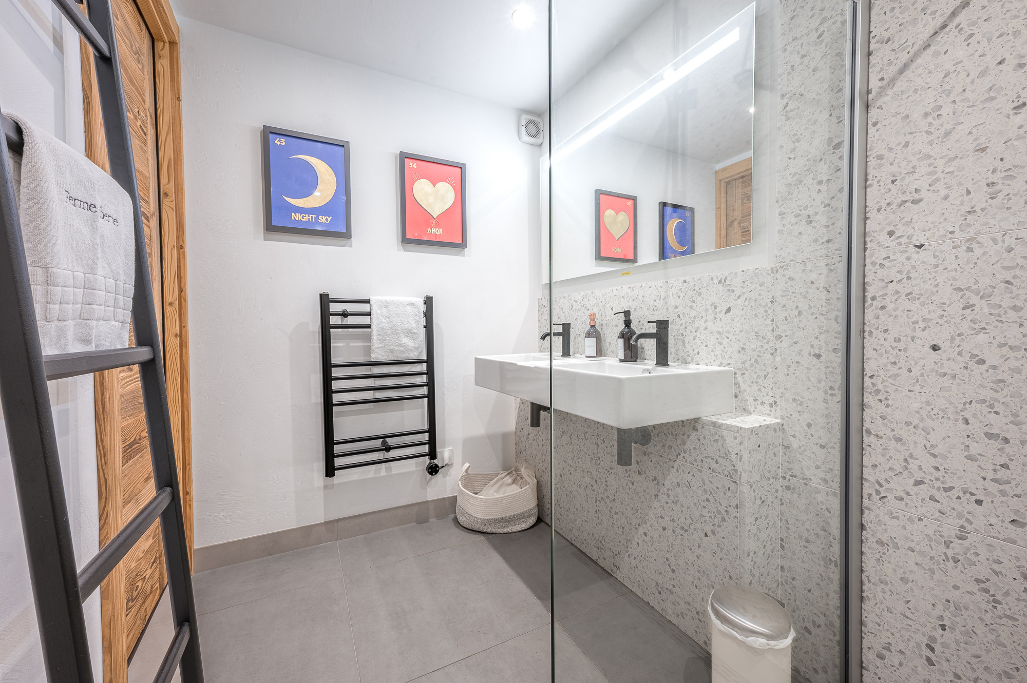 - On the mezzanine floor, 1 double room with a 160x200cm bed and its adjoining shower room with double vanity.